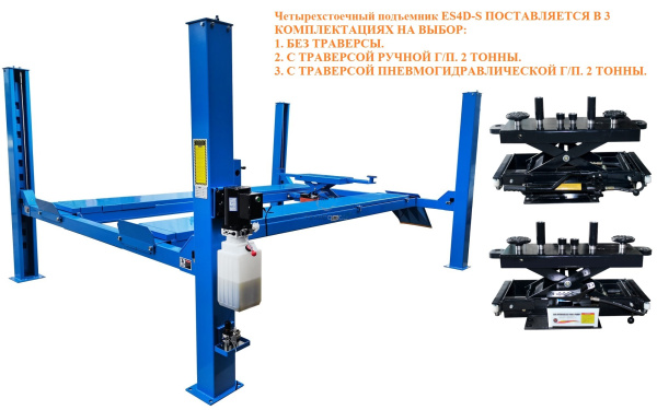 Подъемник электрогидравлический четырехстоечный на 4 тонны F4D-4 (длинна платформ 4850 мм, общая с трапами 6153 мм, расстояние между стойками 2910 мм), предназначен для слесарных работ и системы сход-развал колес, оснащен местами для поворотных кругов и задними сдвижными платформами, оборудован гидравлической траверсой грузоподъемностью 2 тонны, синхронизация тросовая по периметру, каждая стойка имеет блокировку по безопасности ...