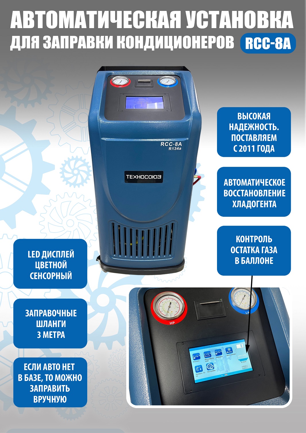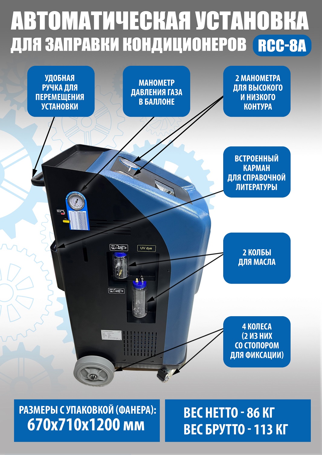 Автоматическая станция для заправки автокондиционеров RCC-8А предназначена для обслуживания и замены фреона в автомобильных кондиционерах. База данных (более 6000 автомобилей), выбор по марке, году выпуска, объему двигателя. Встроенный принтер. Программа тестирования и проверки основных узлов. Цветной LCD дисплей. Меню на Русском языке. Бесплатное обновление базы. Гарантия 1 год.