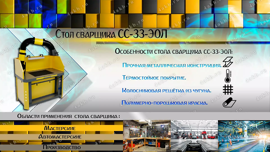 Стол СС-33-ЭОЛ специализируется на проведении сварочных, слесарных работ, и в то же время предназначается для чистки и шлифовки разных металлических деталей. Он используется на ремонтных и строительных площадках, на производствах, на сварочных и слесарных цехах. Также стол может применятся как пост или рабочее место мастера. Стол СС-33-ЭОЛ изготавливается из высокопрочной стали. Цельносварный каркас покрывается полимерно-порошковой краской.